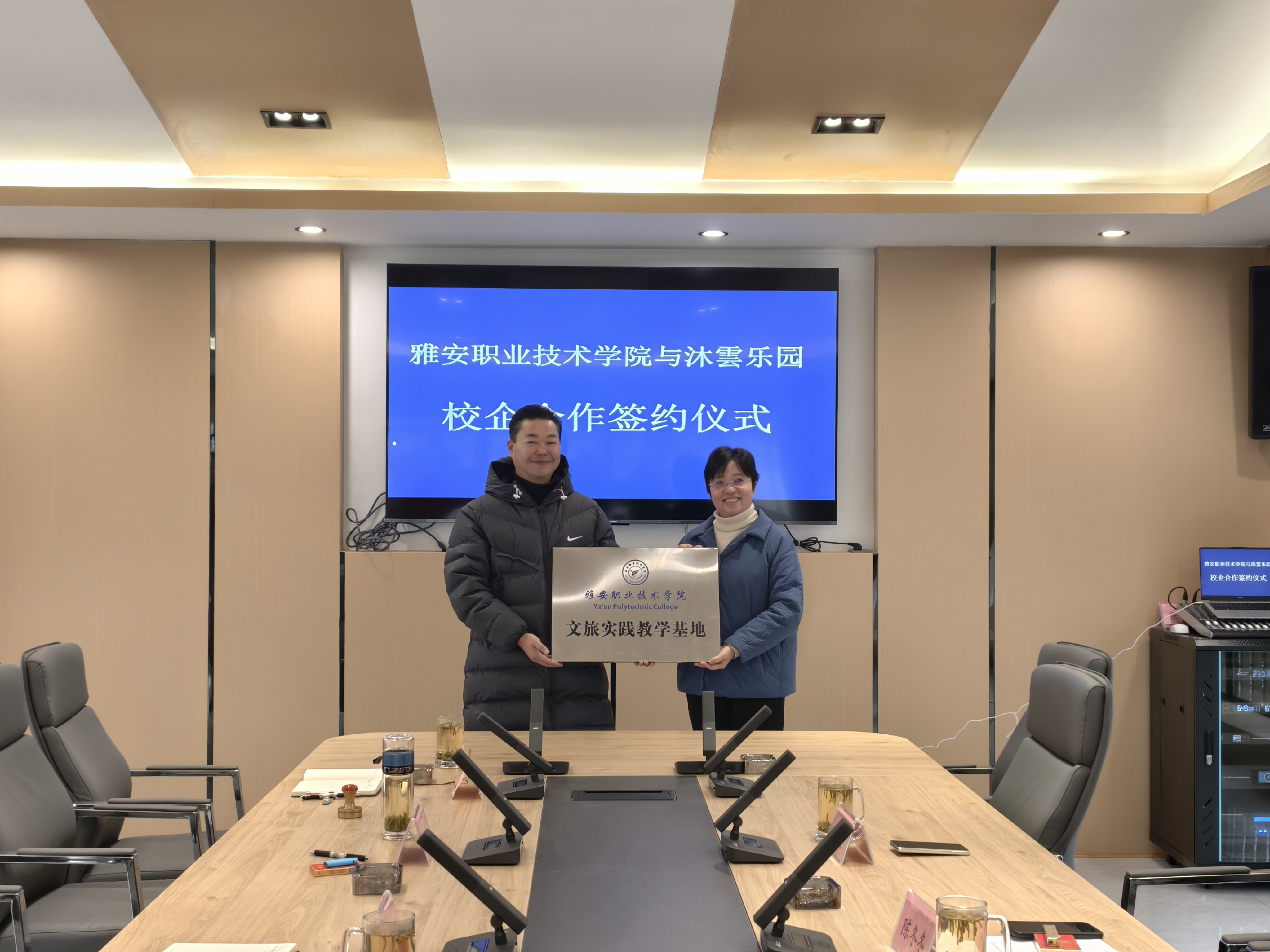 1月6日,学校与天全县沐雲乐园校企合作签约暨“文旅实践教育基地”挂牌仪式在沐雲乐园举行。学校副校长彭裕红,党委委员、副校长陈冬冬,天全县国投公司董事长、总经理王志勋,天全县国投公司副总经理高垚轶,四川宠爱光合旅居信息技术有限公司(沐雲乐园项目)董事长、总经理胡军等共同出席仪式。