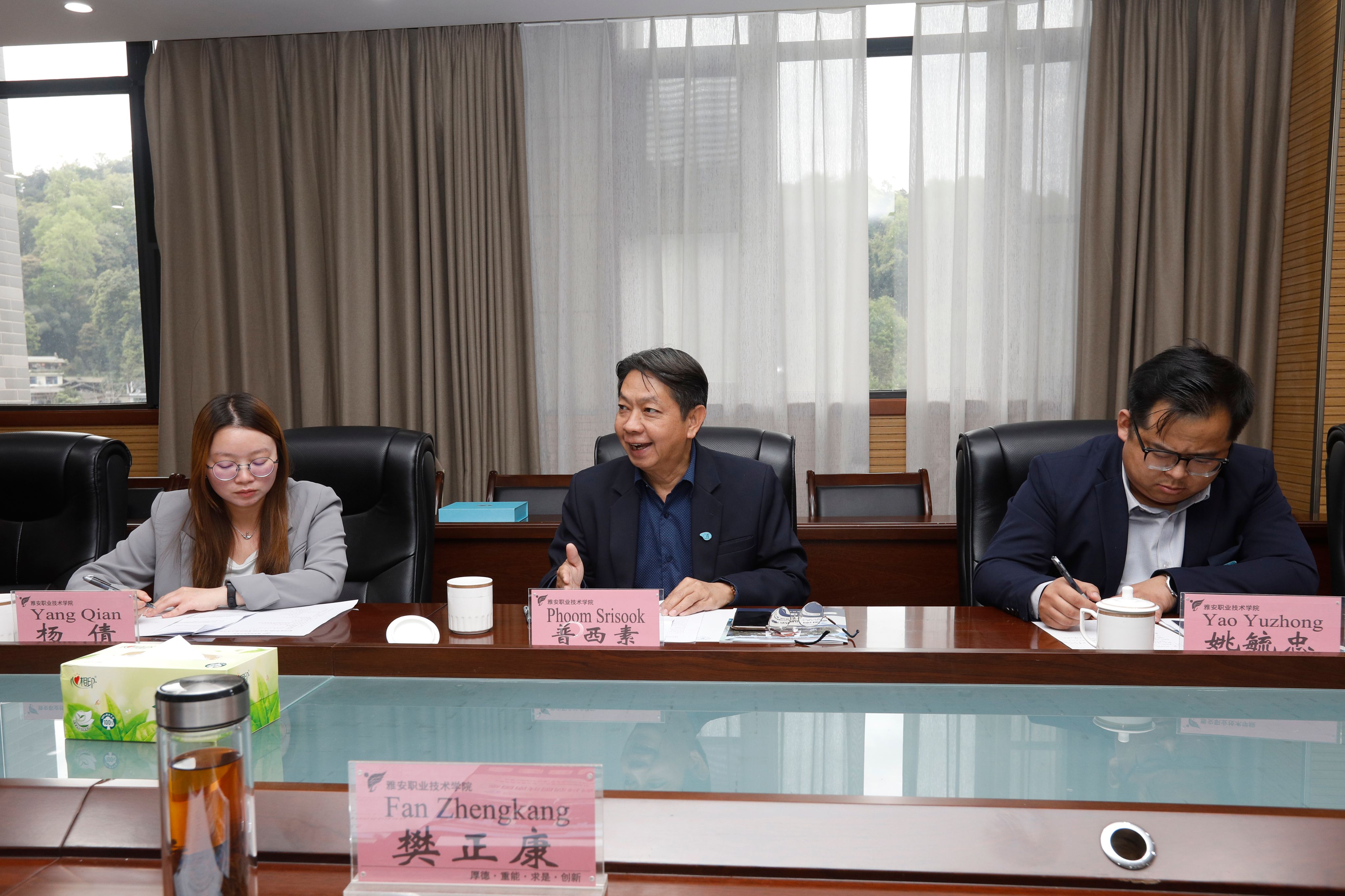 樊正康代表学校对代表团表示热烈欢迎,并介绍了学校的发展历程、办学特色、专业建设及国际交流情况。他重点阐述了beat365官网在推动茶文化、中医药文化与职业教育融合方面的探索,以及留学生教育、海外学院建设等方面取得的成果,表达了与泰方深化合作的意愿。