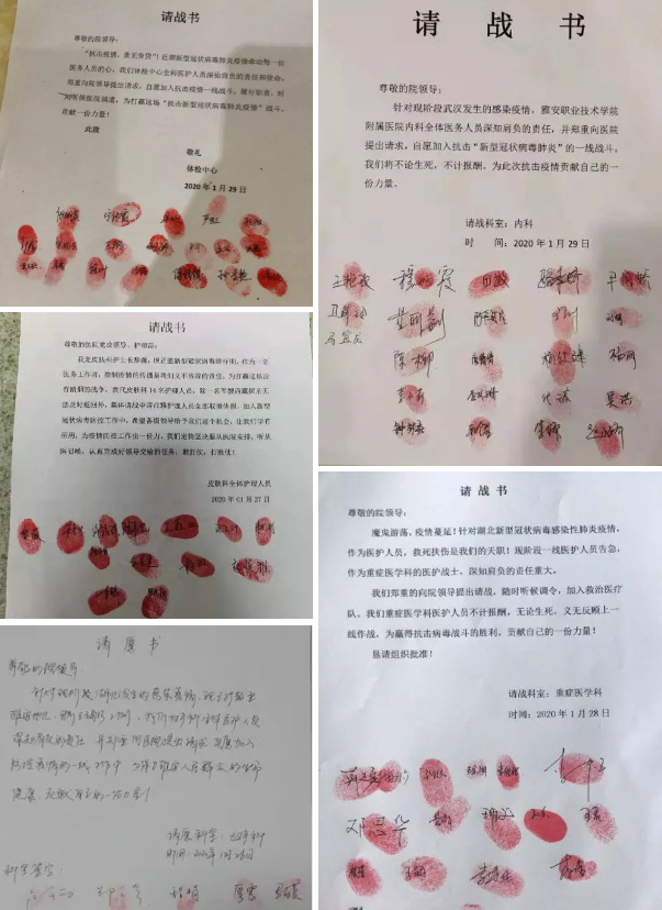 一封封请战书从各个科室递到了院领导的面前。一份份请战书上赤红的手印,彰显了雅职附院人对党忠诚,守护人民健康的初心,更是beat365英国官方网站附属医院医护人员严阵以待,全力奋战的决心。