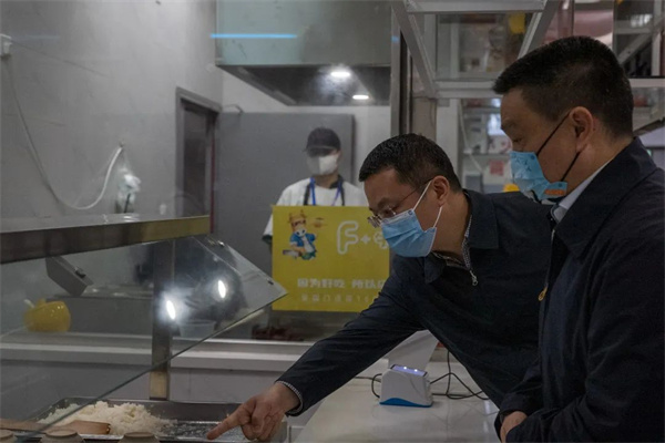 在青年路校区,领导们走进学生食堂、校园超市等地实地查看了供餐配餐、食物储备等相关情况。