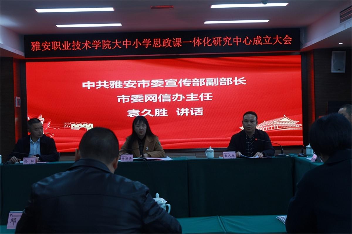 最后,袁久胜在讲话中表示,成立研究中心,推进雅安市大中小学思政课一体化建设,对推动雅安教育事业高质量发展,助力人才强市和川西教育中心建设,具有重要意义。他提出了三点希望和要求,一是要办好人民满意的教育;二是要多角度思考、全方位认识“大中小”的深刻内涵,一体化开展教学研讨、创新教学、整合教学资源,打造具有地域特色的雅安思政品牌;三是要做好思政教学,落实立德树人根本任务,借助一体化研究中心平台,奋力开创“大思政课”建设新局面。