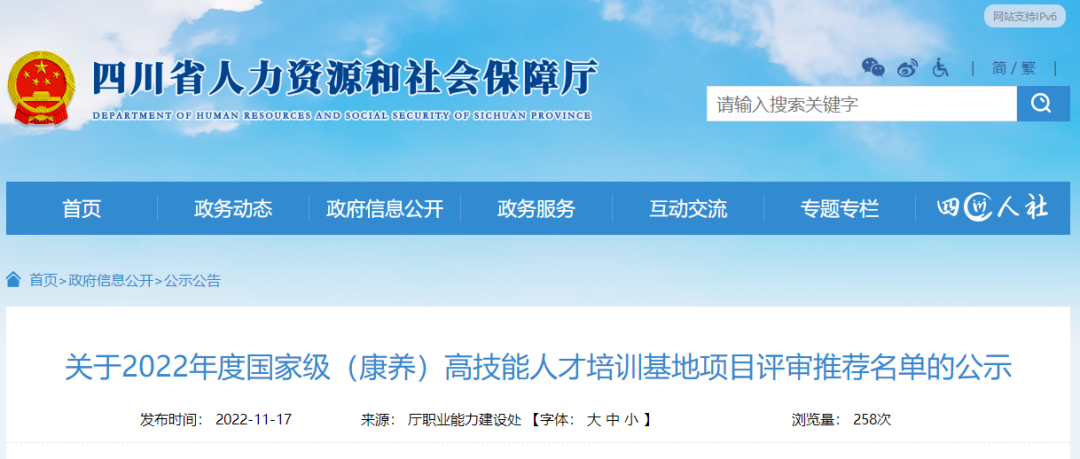 近日,四川省人力资源和社会保障厅发布了《关于2022年度国家级(康养)高技能人才培训基地项目评审推荐名单的公示》。