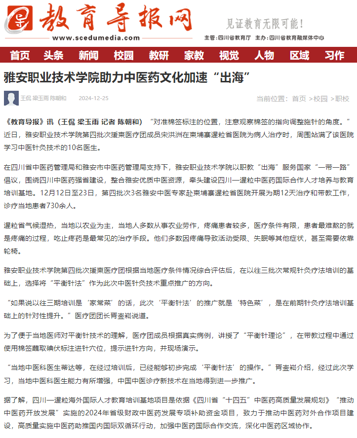 在四川省中医药管理局和雅安市中医药管理局支持下,beat365英国官方网站以职教“出海”服务国家“一带一路”倡议,围绕四川中医药强省建设,整合雅安优质中医资源,牵头建设四川—暹粒中医药国际合作人才培养与教育培训基地。12月12日至23日,第四批次3名雅安中医专家赴柬埔寨暹粒省医院开展为期12天治疗和带教工作,诊疗当地患者730余人。